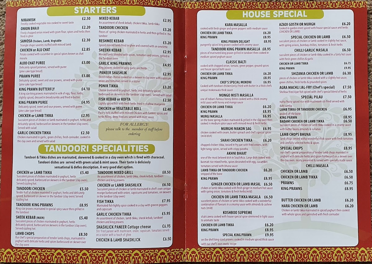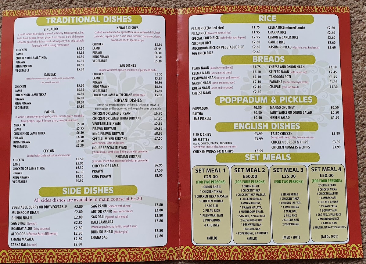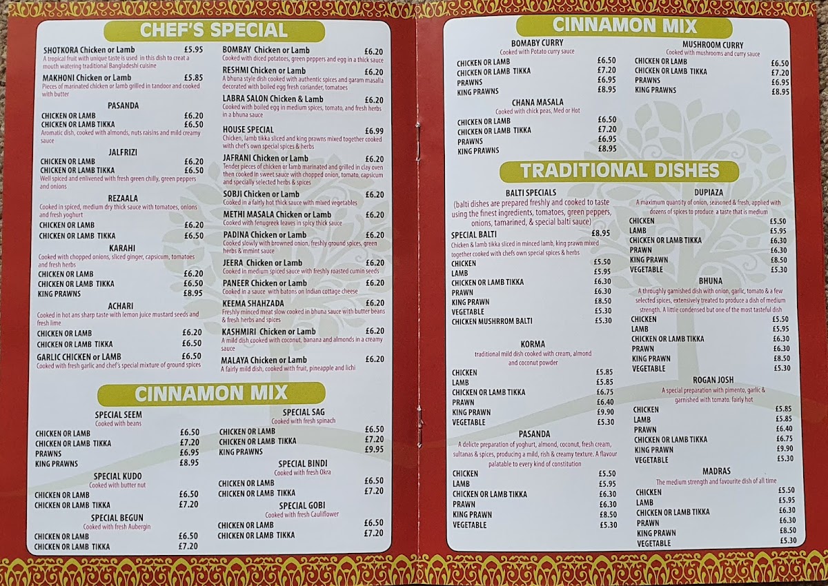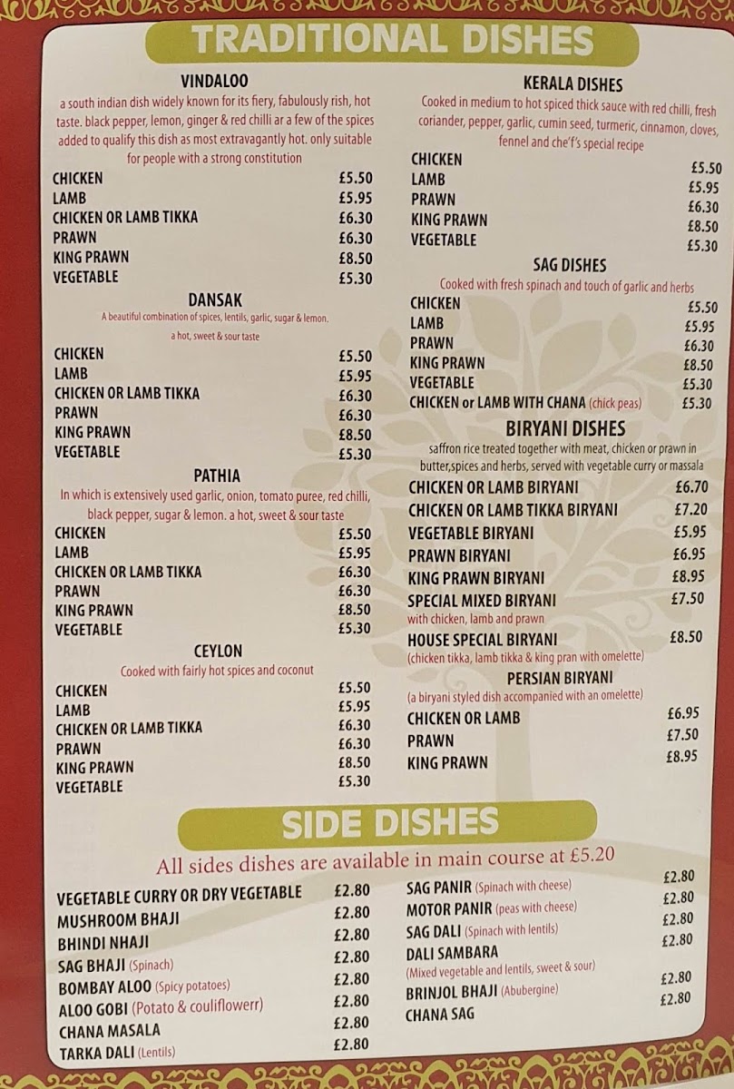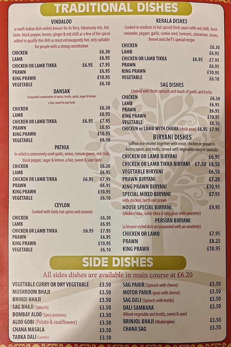 The Cinnamon Tree offers a straightforward and satisfying Indian menu that balances traditional dishes with familiar flavors, fitting comfortably into a casual dining or takeaway setting. The menu features a variety of classic options like Chicken Vindaloo and Pilau Rice, alongside comforting specialties such as Chicken Dhansak, inviting you to enjoy a meal that’s both grounded and flavorful.